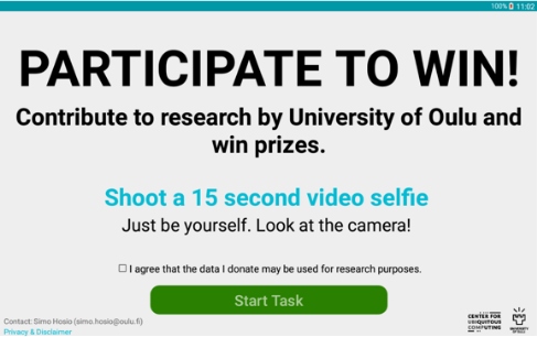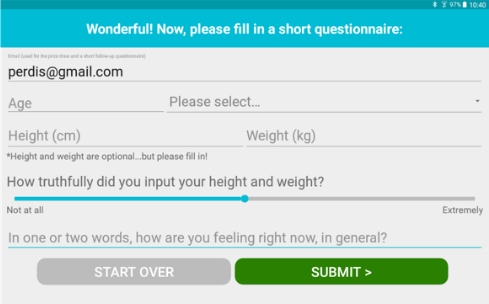 Over the course of 61 days (4 days of pilot study + 57-day field study), we collected a total of 199 selfie videos, corresponding to 3 videos per day. Further, we received 78 metadata submissions to supplement the videos. 63 of those left their email addresses, and of those 22 proceeded to provide online questionnaire responses (a 35% conversion ratio)