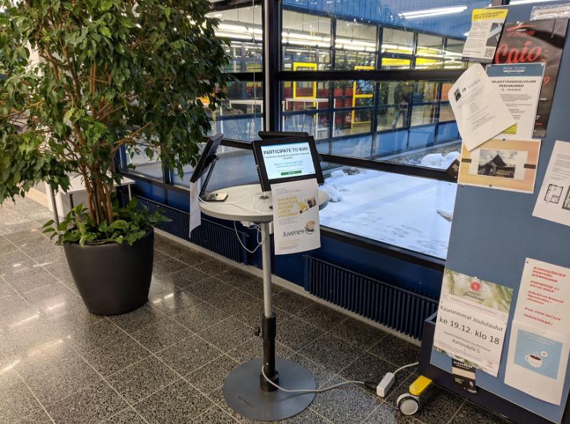 We used a made-to-order desk with adjustable height and a circular wooden tabletop that hosts three Android tablet mounts. This setup makes it possible for 1–3 people to use the desk at the same time. Users cannot, however, easily see the screens of other users without consciously making an effort to peek by moving aside. We purchased a prepaid SIM card with unlimited data plan and used our own router, so that the deployment depended only on access to power and would not suer from WiFi outages or poor connection quality.
